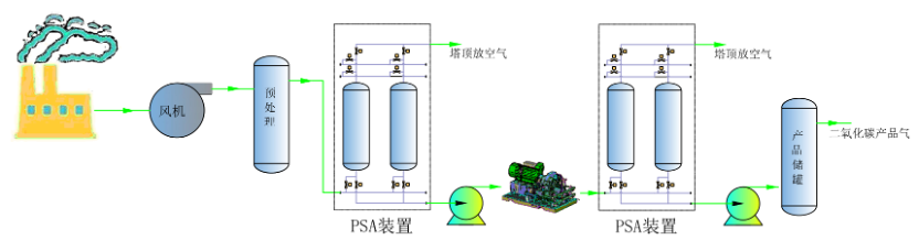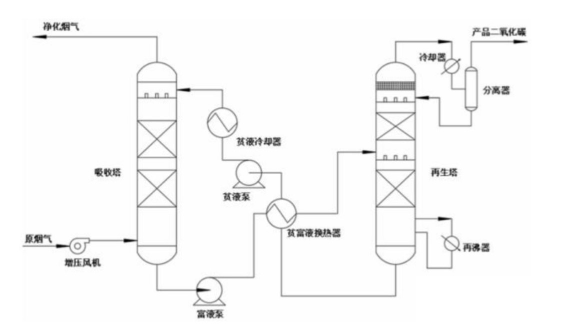 石灰窑气、水泥窑气、玻璃窑气、烟道气、发酵气等富含一定的二氧化碳。不同气源的二氧化碳的分压差距较大,碳和公司根据不同的气源成分,开发了两种二氧化碳回收技术:一是低分压二氧化碳有机胺吸收技术,可将气源中8~15%(vol)的二氧化碳提纯至99%以上,二氧化碳收率为90%以上,采用专利胺溶液进行二氧化碳的吸收分离,具有二氧化碳吸收能力高、再生能耗低、基本消除氧气降解副反应以及设备腐蚀极小等优点;二是二氧化碳变压吸附(PSA)回收专利技术,可将二氧化碳提高至90%以上,二氧化碳的回收率70~90%,利用专有吸附剂对二氧化碳捕集解吸,具有运行费用低,自动化程度高,设备寿命长,无三废产生等优点;以上2种二氧化碳气体通过进一步纯化/液化可以获得工业级或食品级二氧化碳产品,实现碳捕集和利用。