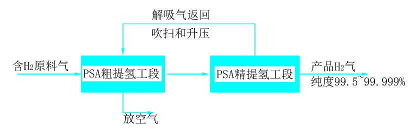 含氢(H₂)原料气进入PSA变压吸附装置吸附塔后,吸附床内的吸附剂在加压时吸附原料气中的杂质,不易吸附的组分(氢气)从吸附床出口端作为产品输出,减压时,吸附的杂质组分脱附解吸,同时吸附剂获得再生,采用多个吸附床循环操作,实现产品氢连续输出。高纯度氢气,采用多个PSA装置串联,产品氢气纯度可达99.5~99.999%。