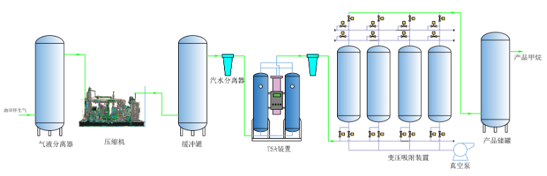 伴生气处理工艺包括降温脱水、压缩、脱水除杂、PSA提纯甲烷等步骤。