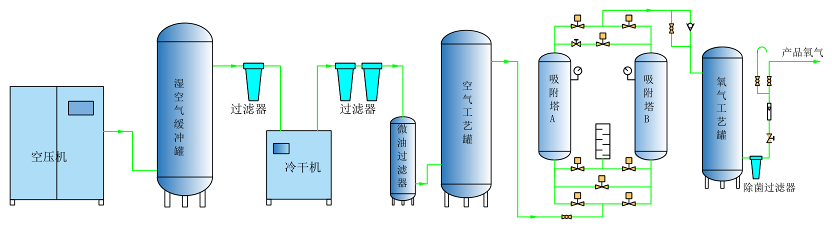 PSA变压吸附制氧工艺流程分为三个部分:气源压缩、净化、PSA分离。