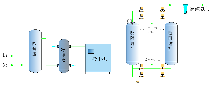加氢纯化:加氢型氮气纯化采用贵金属钯为催化剂,氮气中的氧气和氢气在一定温度和催化剂中反应生成水并除去而使氮气纯度达到99.9995以上的一种气体纯化方式。它是一种氮气终端纯化装置,其反应方程式为: